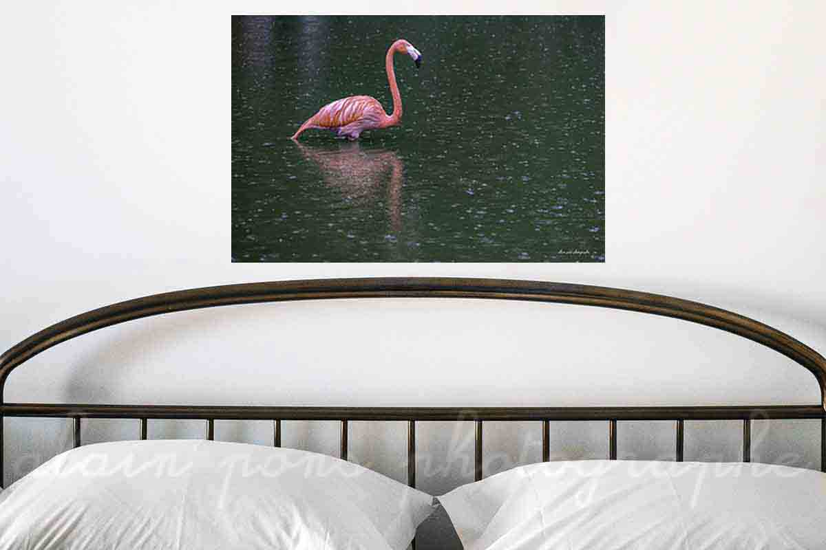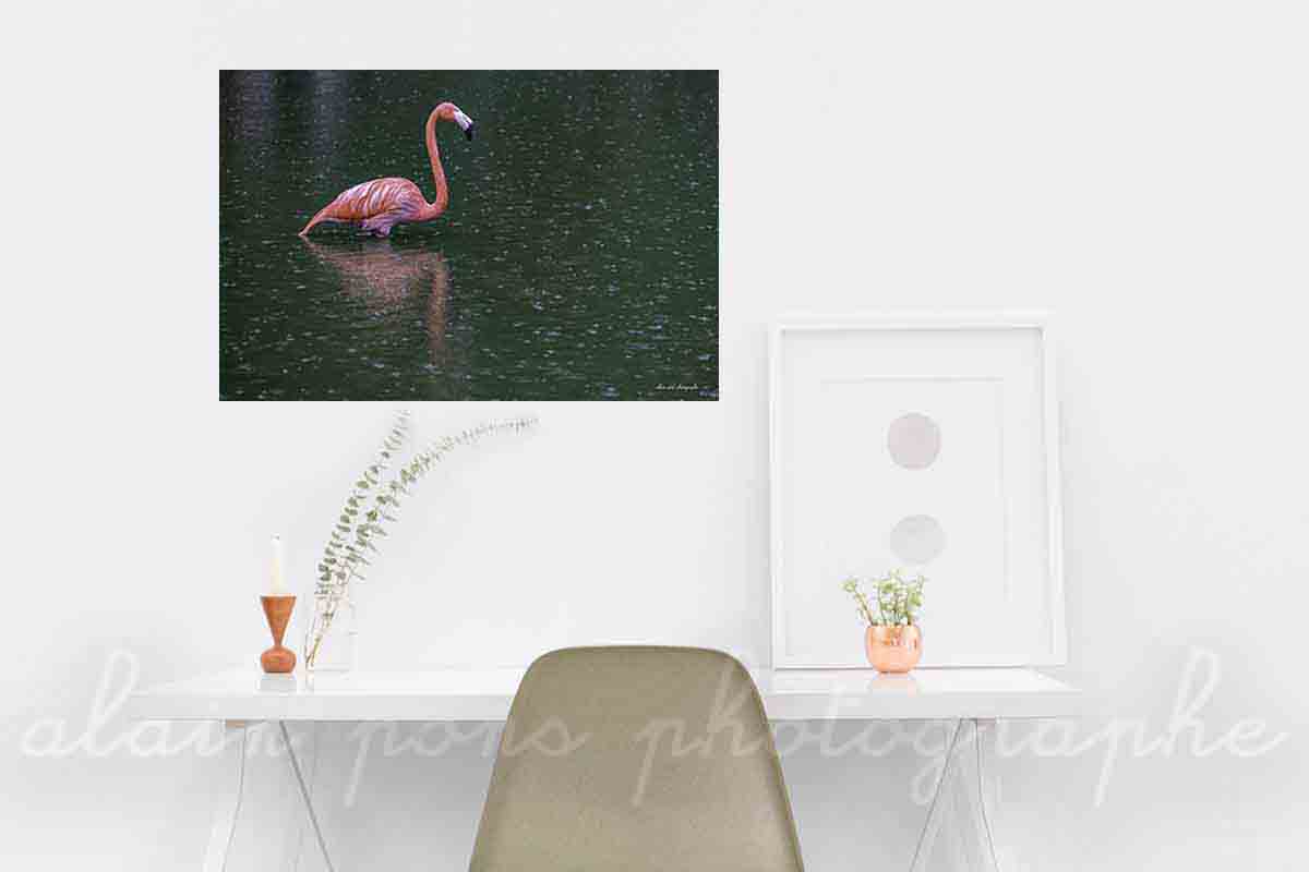 Photographie Un flamant rose sous la pluie, au Parc des Oiseaux de Villars-les-Dombes, dans l’Ain, région de la Bresse avec son célèbre poulet…