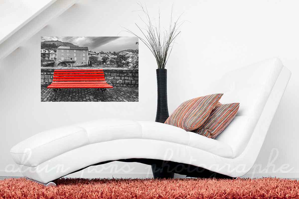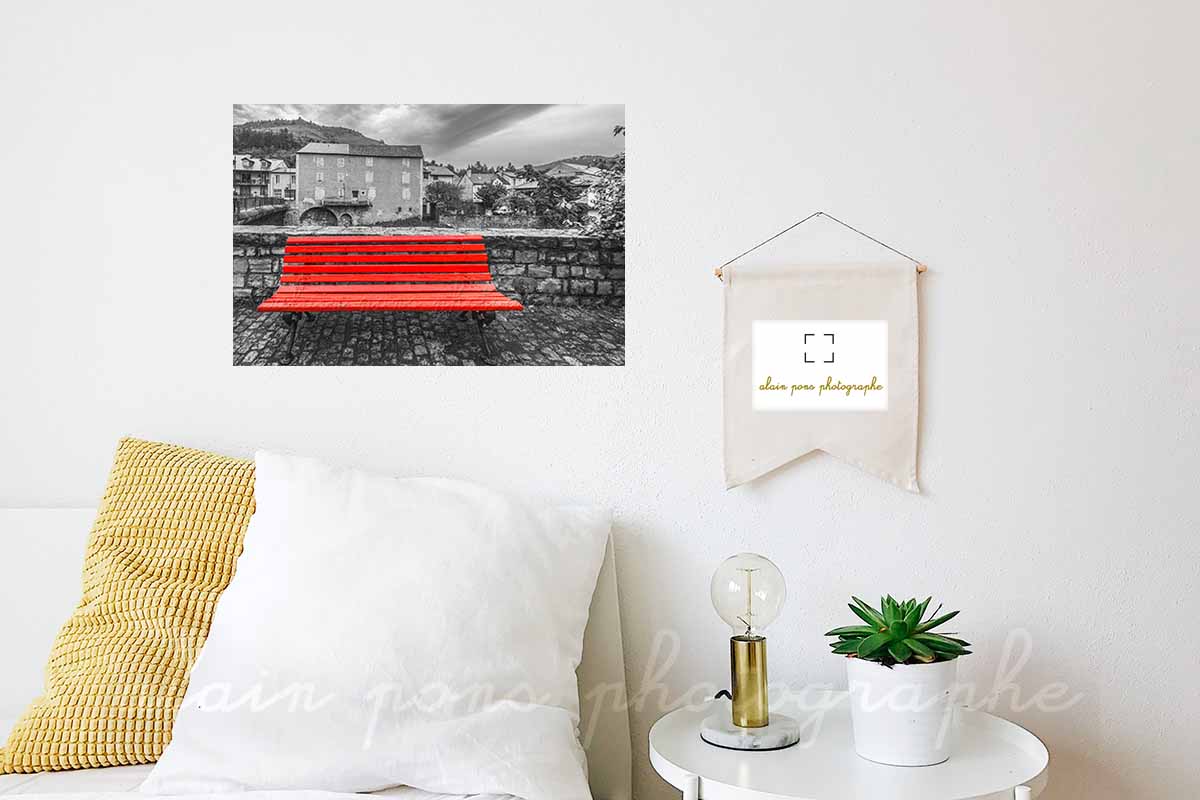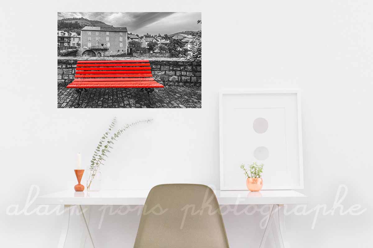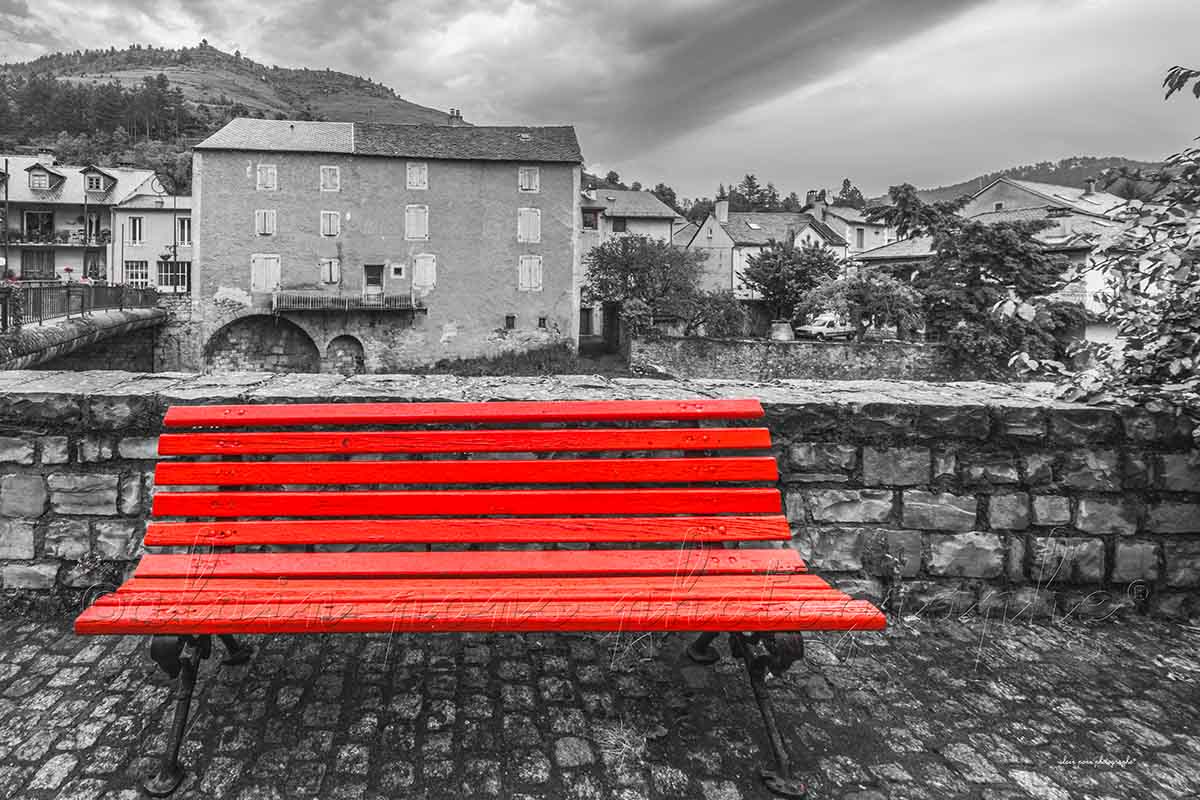 Photographie le banc rouge à Meyrueis, Lozère, France